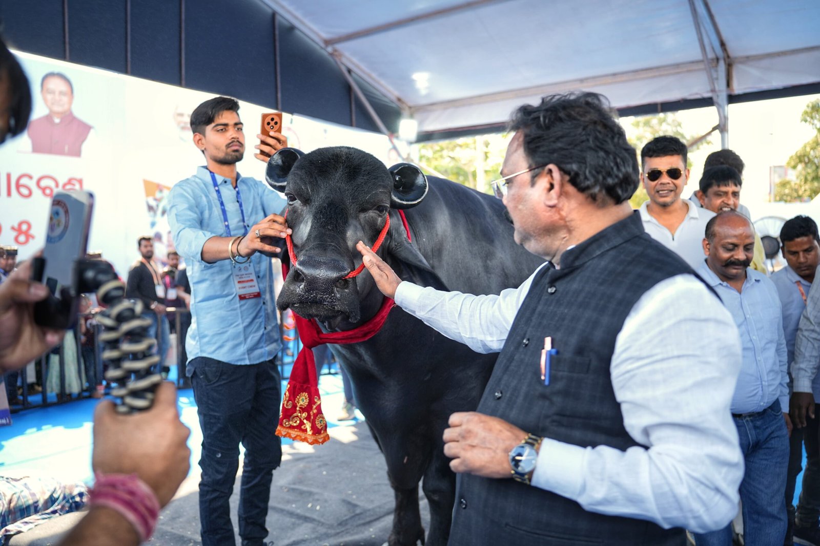 ଭୁବନେଶ୍ବର ବରମୁଣ୍ଡା ଖେଳ ପଡିଆଠାରେ ଚାଲିଥିବା ରାଜ୍ୟସ୍ତରୀୟ ମତ୍ସ୍ୟ-ପ୍ରାଣୀ ସମାବେଶ, ଓଡ଼ିଶାରେ ସାମିଲ ହୋଇଛନ୍ତି ରାଜ୍ୟର ବିଭିନ୍ନ ଅଞ୍ଚଳର ମତ୍ସ୍ୟଚାଷୀ ଓ ବିଭିନ୍ନ ବର୍ଗର ପ୍ରାଣିପାଳକ l ଏହି ସମାବେଶରେ ସମସ୍ତଙ୍କର ଆକର୍ଷଣର କେନ୍ଦ୍ର ପାଲଟିଛି ରାଜସ୍ତାନର ମଇଁଷି ଷଣ୍ଢ ‘ଭୀମ’ l ‘ଭୀମ’ର ଜୀବନଶୈଳୀ, ଖାଦ୍ଯଶୈଳୀ ଓ ଭାବଭଙ୍ଗିମା ଲୋକଙ୍କ ମଧ୍ୟରେ ବିଶେଷ କୌତୁହଳ ଜାଗ୍ରତ କରୁଛି l ରାଜସ୍ଥାନ ଯୋଧପୁର ସହରରୁ ରାଜ୍ୟସ୍ତରୀୟ ମତ୍ସ୍ୟ-ପ୍ରାଣୀ ସମାବେଶ, ଓଡ଼ିଶାକୁ ଆସିଛି ମଇଁଷି ଷଣ୍ଢ ‘ଭୀମ’ l ‘ଭୀମ’ ହେଉଛି ମୁରା ପ୍ରଜାତିର ମଇଁଷି ଷଣ୍ଢ l ‘ଭୀମ’ର ରଙ୍ଗ ଚିକ୍କଣ କଳା, ଓଜନ ପ୍ରାୟ ୧୫୦୦ କିଲୋଗ୍ରାମ ଓ ଉଚ୍ଚତା ପ୍ରାୟ ୬ ଫୁଟ l ‘ଭୀମ’କୁ ବର୍ତ୍ତମାନ ୯ ବର୍ଷ l ରାଜସ୍ଥାନର ଶ୍ରୀ ଜବାହରଲାଲ ଜାଙ୍ଗିଦଙ୍କ ଦ୍ବାରା ପ୍ରତିପାଳିତ ‘ଭୀମ’ର ସୁନ୍ଦର ଓ ବଳିଷ୍ଠ ସ୍ବାସ୍ଥ୍ୟ, ବିଶାଳ ଆକାର ଓ ଉଚ୍ଚକୋଟିର ଶୁକ୍ରାଣୁ ପାଇଁ ସମଗ୍ର ଦେଶରେ ସ୍ବତନ୍ତ୍ର ଖ୍ଯାତି ରହିଛି l