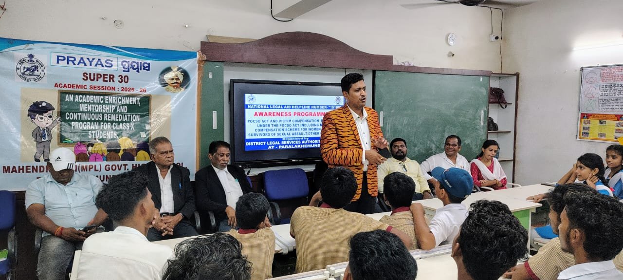 ଗଜପତି(ଜୟ ଓଡିଶା) : - ପାରଳାଖେମୁଣ୍ଡିର ମହେନ୍ଦ୍ରଗିରି ମ୍ୟୁନିସିପାଲିଟି ସରକାରୀ ଉଚ୍ଚ ବିଦ୍ୟାଳୟରେ ଜିଲ୍ଲା ଆଇନ ସେବା ପ୍ରାଧିକାରଣ ଦ୍ୱାରା ସଚେତନତା କାର୍ୟକ୍ରମ ଆୟୋଜିତ ହୋଇଥିଲା। କାର୍ୟକ୍ରମରେ ପ୍ରୋଟେକ୍ସନ ଅଫ୍ ଚିଲ୍ଡ୍ରେନ୍ ଫ୍ରମ୍ ସେକ୍ସୁଆଲ୍ ଅଫେନ୍ସେସ୍ (POCSO) ଆକ୍ଟ, ପୀଡ଼ିତ ପ୍ରତିକ୍ଷୁତି ବ୍ୟବସ୍ଥା ଓ ନାଲସାଙ୍କ 2018ରେ ନିର୍ଦ୍ଦିଷ୍ଟ ନାରୀ ପୀଡ଼ିତ/ବଞ୍ଚିଥିବାଙ୍କ ପାଇଁ ପ୍ରତିକ୍ଷୁତି ଯୋଜନା ବିଷୟରେ ଛାତ୍ରଛାତ୍ରୀଙ୍କୁ ସଚେତନ କରାଯାଇଥିଲା। ସଭାରେ ଶ୍ରୀ ବିମଳ ରାଉଲ, ସଚିବ, ଡି.ଏଲ୍.ଏସ୍.ଏ, ଗଜପତି ଅଧ୍ୟକ୍ଷତା କରିଥିଲେ ଏବଂ ଛାତ୍ରଛାତ୍ରୀଙ୍କୁ ଶିଶୁ ସୁରକ୍ଷା ସମ୍ବନ୍ଧୀୟ ନିୟମକାନୁନ ଓ ଆଇନୀ ସଚେତନତାର ଗୁରୁତ୍ୱ ବିଷୟରେ ଉଦ୍ବୋଧନ କରିଥିଲେ। ଏହି ଅବସରରେ ଶ୍ରୀ ରାଜେଶ କୁମାର ମିଶ୍ର, public prosecutor, district court, ଗଜପତି; ଶ୍ରୀ ଆର୍. ବାବୁ ରାଓ, ବରିଷ୍ଟ ଆଇନ ଯିବି; ଶ୍ରୀ ଜି. ଚିତି ବାବୁ, ବରିଷ୍ଠ ଆଇନ ଯିବି, ପାରଳାଖେମୁଣ୍ଡି ବାର୍ ଅସୋସିଏସନ୍; ଶ୍ରୀ ଡି. ଅନୁପ କୁମାର, ସହାୟକ ଅଭିଯୋଗ ନିର୍ଦ୍ଦେଶକ; ଏବଂ ଶ୍ରୀ ପୂର୍ଣ୍ଣଚନ୍ଦ୍ର ପ୍ରଧାନ, ପ୍ରଧାନ ଶିକ୍ଷକ, ଏମ୍.ଏମ୍. ହାଇସ୍କୁଲ୍, ପାରଳାଖେମୁଣ୍ଡି ଉପସ୍ଥିତ ଥିଲେ। ସମସ୍ତେ ଛାତ୍ରଛାତ୍ରୀଙ୍କୁ ବିଭିନ୍ନ ଆଇନୀ ପ୍ରାସଙ୍ଗିକତା ବିଷୟରେ ଅବଗତ କରିଥିଲେ ଏବଂ ନିଜ ଅଧିକାର ସଚେତନ ହୋଇ ସମାଜକୁ ସୁରକ୍ଷିତ କରିବାକୁ ପ୍ରେରିତ କରିଥିଲେ।